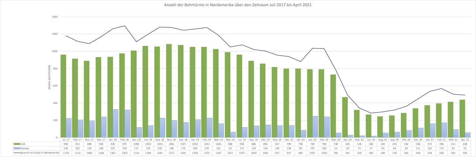 Nachfolgend noch einmal die Entwicklung, nachdem es in den Monaten vor Juli 2017 eine stete Zunahme der im Einsatz befindlichen Bohrtürme gegeben hatte und im Juli Stillstand und danach einen Rückgang – mit erneuter Belebung zum Jahresbeginn 2019 und kontinuierlichem Rückgang seit März 2019 bis Juni 2020 und Stagnation im Juli und leichter Belebung im August mit weiter leichter Zunahme September/Oktober/November/Dezember, mit der starken Zunahme zum Jahreswechsel und der spürbaren Abnahme seit März 2021.