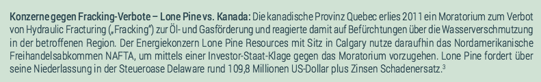 energiepolitischer Maßnahmen zu verklagen. Dabei betreffen 35% aller bekannten derartigen Forderungen die Bereiche Öl, Bergbau, Erdgas oder Elektrizität. Klagen im Energiesektor steigen stetig an. Vom deutschen Atomausstieg bis hin zum Fracking–Moratorium der kanadischen Provinz Quebec* – große Konzerne nutzen die unfairen Schiedsgerichtsklauseln, um praktisch jede Form progressiver Gesetzgebung zu verhindern oder deren Kosten zu sozialisieren.“ (ebd.) Wegen des Fracking-Moratoriums verklagt nun der kanadische Rohstoffkonzern Lone Pine Kanada über eine Tochterfirma in den USA auf der Grundlage des Nordamerikanischen Freihandelsabkommens (NAFTA) auf 250 Millionen US$ (ZEIT, 6. März 2014). Solche Klagen drohen hierzulande, wenn CETA verabschiedet ist. Es ist bekannt, dass von kanadischer Seite gerade die Bergbauunternehmen („mining companies“)CETA vorantreiben. CEO schreibt: „Die Investitionsströme aus Kanada in die EU sind von erheblicher Bedeutung in diesen Sektoren und zahlreiche kanadische Bergbauunternehmen sind in der EU bereits an
